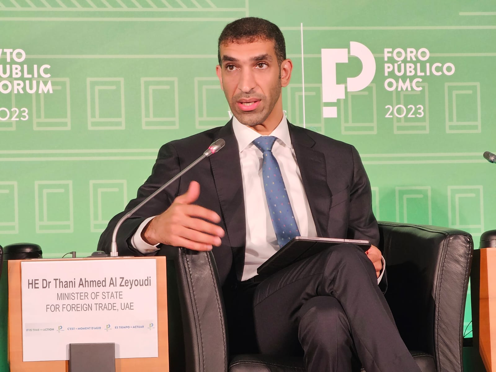 جاء ذلك في الكلمة التي ألقاها معالي الدكتور ثاني بن أحمد الزيودي وزير دولة للتجارة الخارجية، لدى مشاركته على رأس وفد إماراتي رفيع المستوى، في المنتدى العام لمنظمة التجارة العالمية المنعقد في جنيف بسويسرا، والذي عقد تحت شعار "حان وقت العمل".