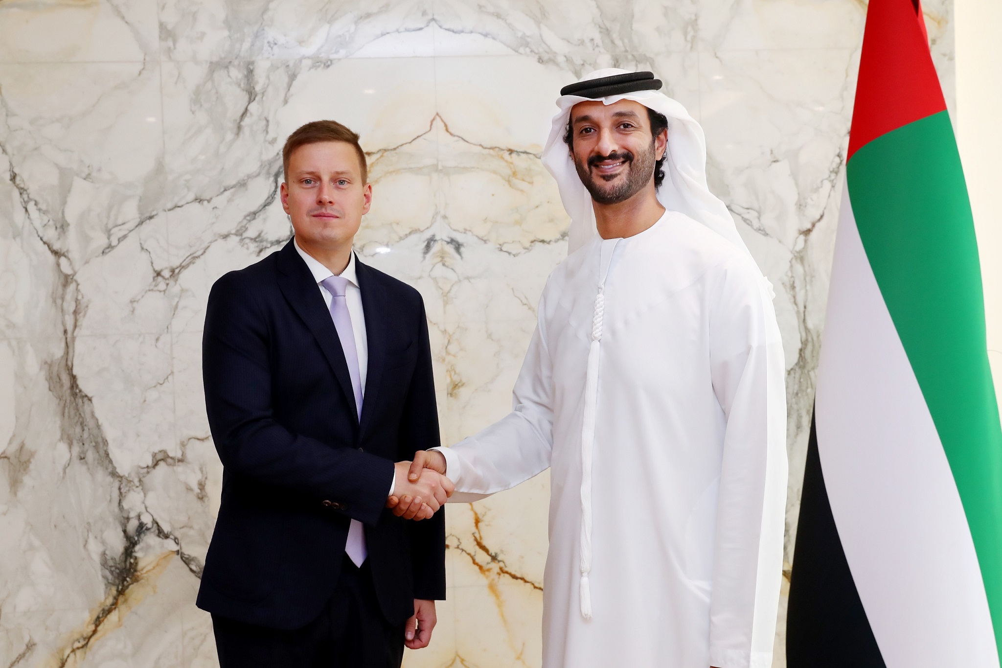 H.E. Abdulla Bin Touq Al Marri, Minister of Economy, met with a delegation from the Republic of Estonia led by H.E. Erkki Keldo, the Minister of Economy and Industry of Estonia. The meeting explored ways to enhance economic cooperation between the two countries in areas of mutual interest, including the new economy, technology, industry, tourism, entrepreneurship, circular economy, and transportation.